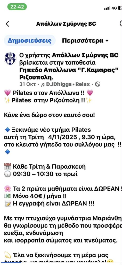 Είναι αδιανόητο, αλλά είναι αληθινό… Μας το είπαν, το θεωρήσαμε μπλακ χιούμορ, αλλά δυστυχώς είναι πραγματικότητα. Τα ξεφτιλίκια στον ιστορικό Απόλλωνα Σμύρνης δεν έχουν τελειωμό. Έτσι μπροστά στο εμπόριο δεν υπάρχουν ηθικοί φραγμοί. Στον Ερασιτέχνη έχουν φτιάξει τμήμα pilates, ναι σωστά διαβάζετε… Χωρίς δείγμα ντροπής το λένε «Απόλλων pilates», το διαφημίζουν στα social media μάλιστα και η μηνιαία συνδρομή κοστίζει 40 ευρώ με τα μαθήματα να παραδίδονται στο κλειστό του μπάσκετ!