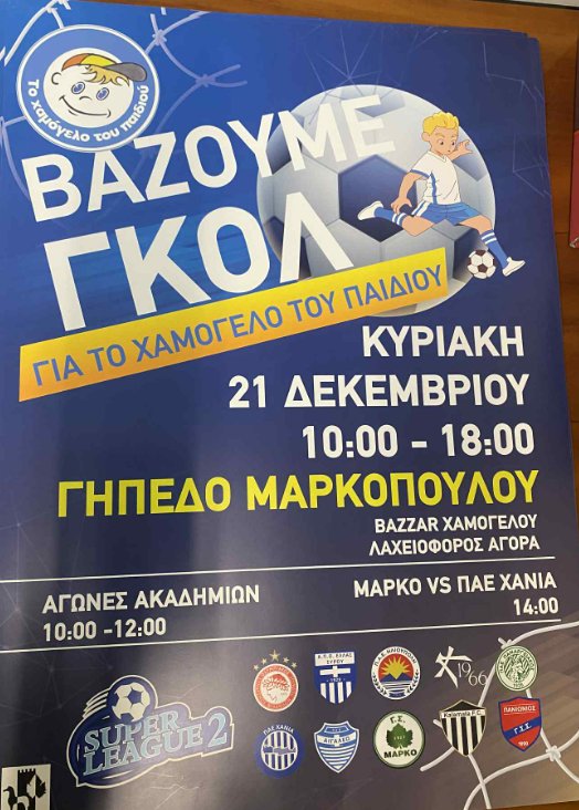 Η διοργανώτρια σε συνεργασία με το «Χαμόγελο του παιδιού» πραγματοποιεί Bazzar με λαχειοφόρο αγορά στο γήπεδο του Μαρκόπουλου την Κυριακή 21 Δεκεμβρίου 2025. Οι εκδηλώσεις θα ξεκινήσουν από τις 10 το πρωί μέχρι τις 6 το απόγευμα πριν, κατά τη διάρκεια και μετά τη διεξαγωγή της αναμέτρησης Μαρκό – Χανιά για τη 15η αγωνιστική του πρωταθλήματος της δεύτερης κατηγορίας.